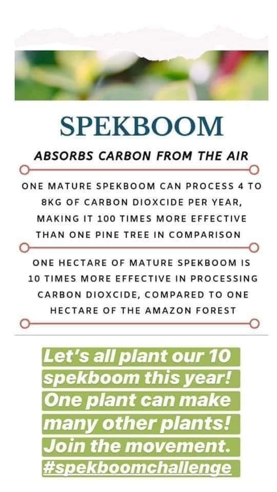 - According to The Spekboom Foundation, “Spekboom has enormous carbon-storing capabilities. Its capacity to offset harmful carbon emissions is compared to that of moist, subtropical forests. This remarkable plant is unique in that it stores solar energy to perform photosynthesis at night. This makes a spekboom thicket 10 times more effective per hectare at carbon fixing than any tropical rainforest.”