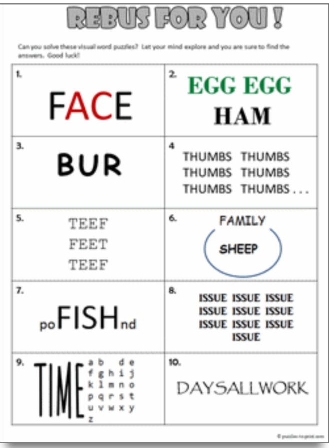 If you like Rebus (pictogram) puzzles then check out these sites! They give answers so you won’t go nuts!